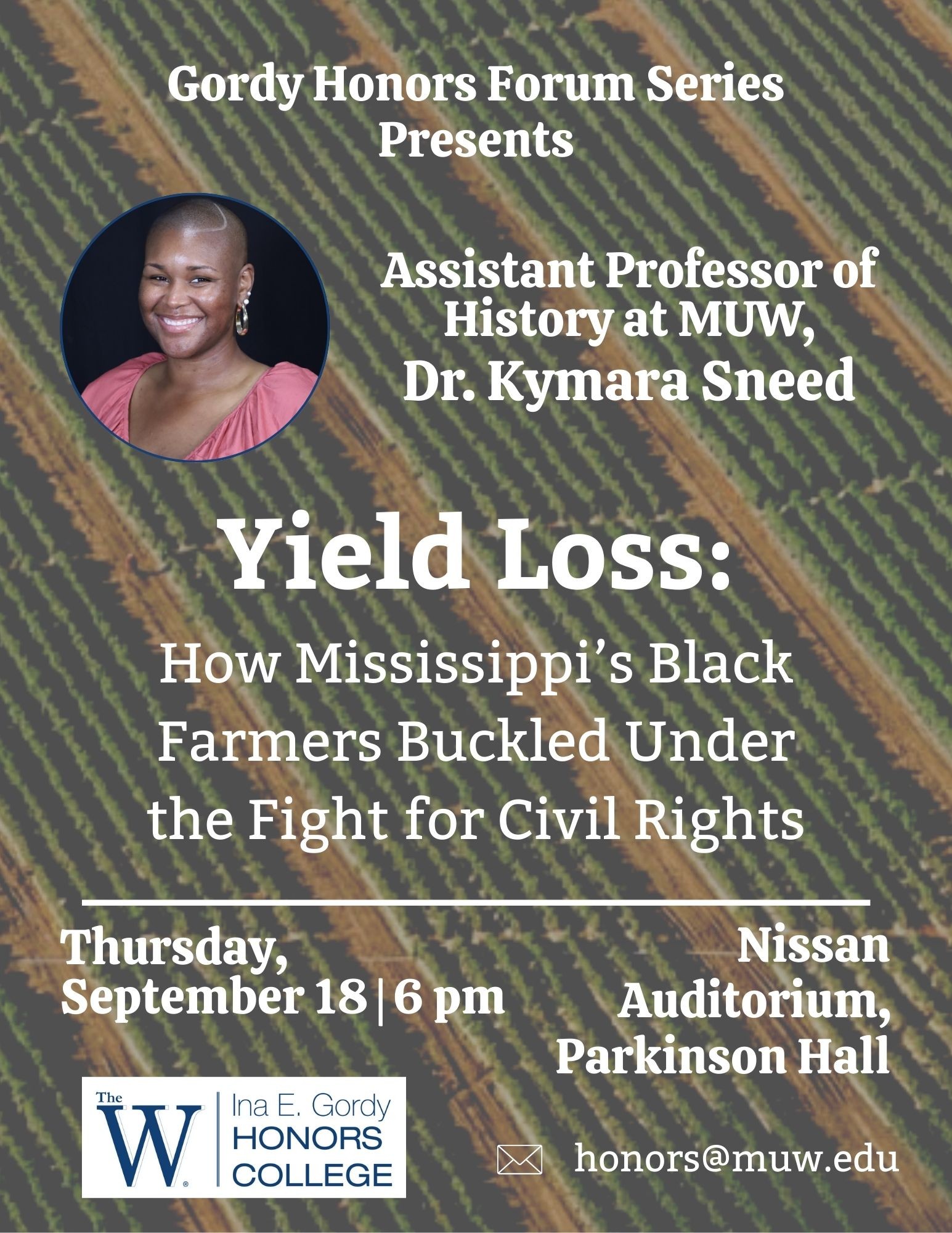 Thursday, September 18 at 6 p.m., Dr. Kymara Sneed, Assistant Professor of History at MUW, will be speaking about the intersection of agriculture and race relations in Mississippi history in "Yield Loss: How Mississippi's Black Farmers Buckled Under the Fight for Civil Rights." Part of the Honors Forum Series, this talk will be held in […] |