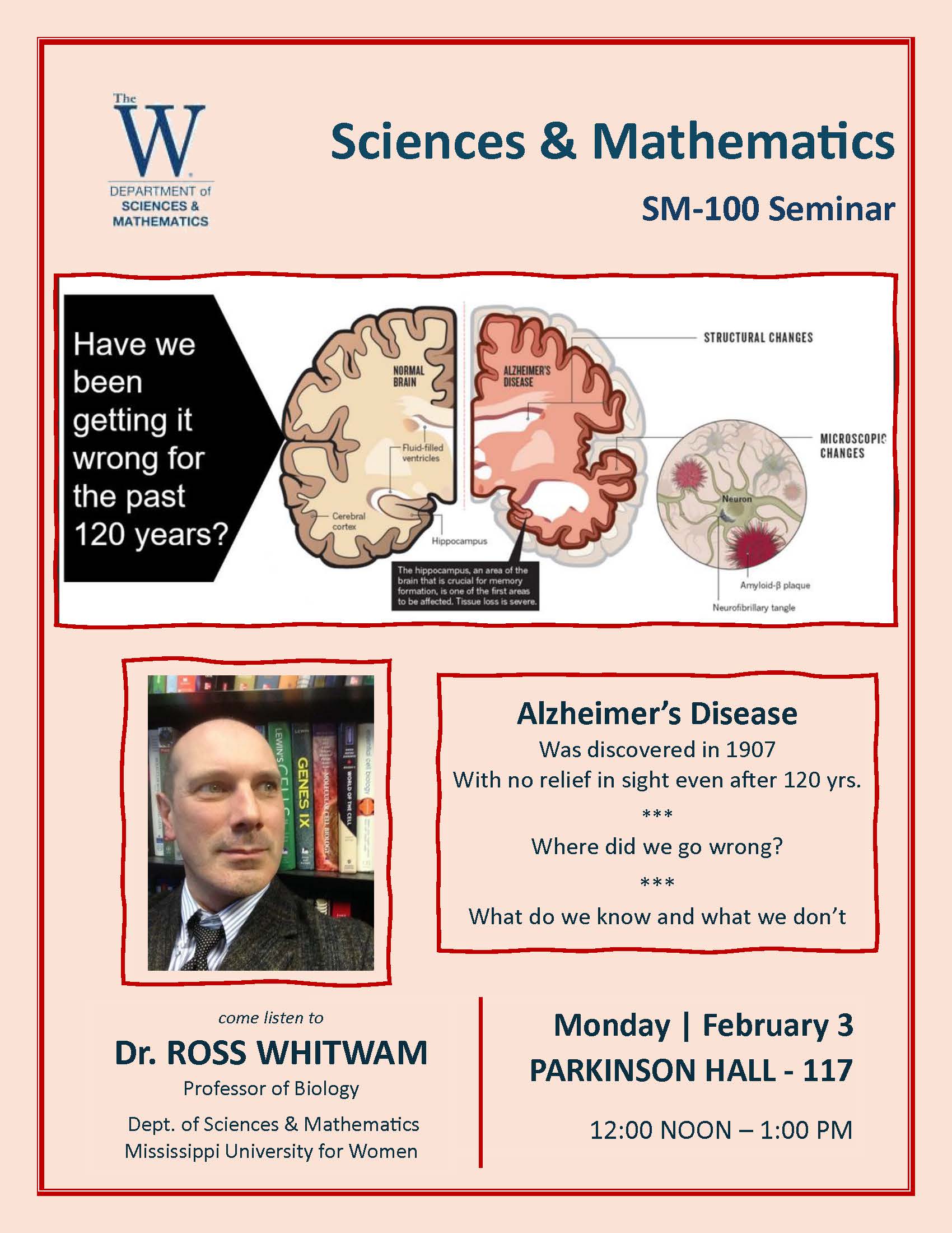 Alzheimer’s disease have we been getting it wrong for the past 120 years? Come listen to Dr. Ross Whitwam for the first SM-100 seminar of the semester this Monday, February 3, at 12 noon in Parkinson Hall Room 117.