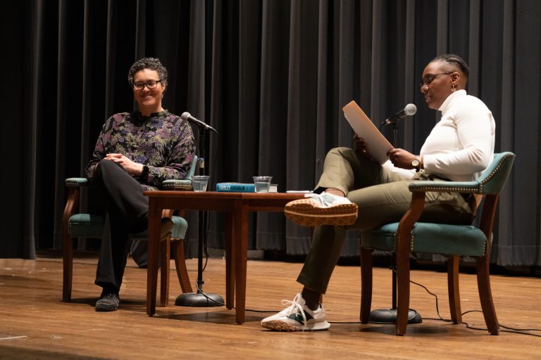 Graduate student Kudzai Munyavi moderates a conversation with Anastasia Curwood at the Martha Swain Lecture Series