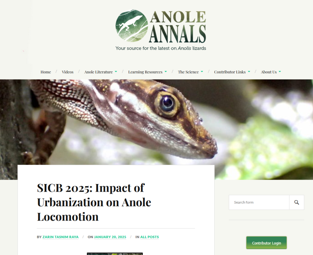 Anole Annals is a website run by and aimed at “anolologists” or people that study anole lizards. On the site, contributing scientists share research news and updates related to anoles and other lizards. The site often seeks contributions from scientists going to conferences, that would be willing to check out and summarize anole-related presentations.