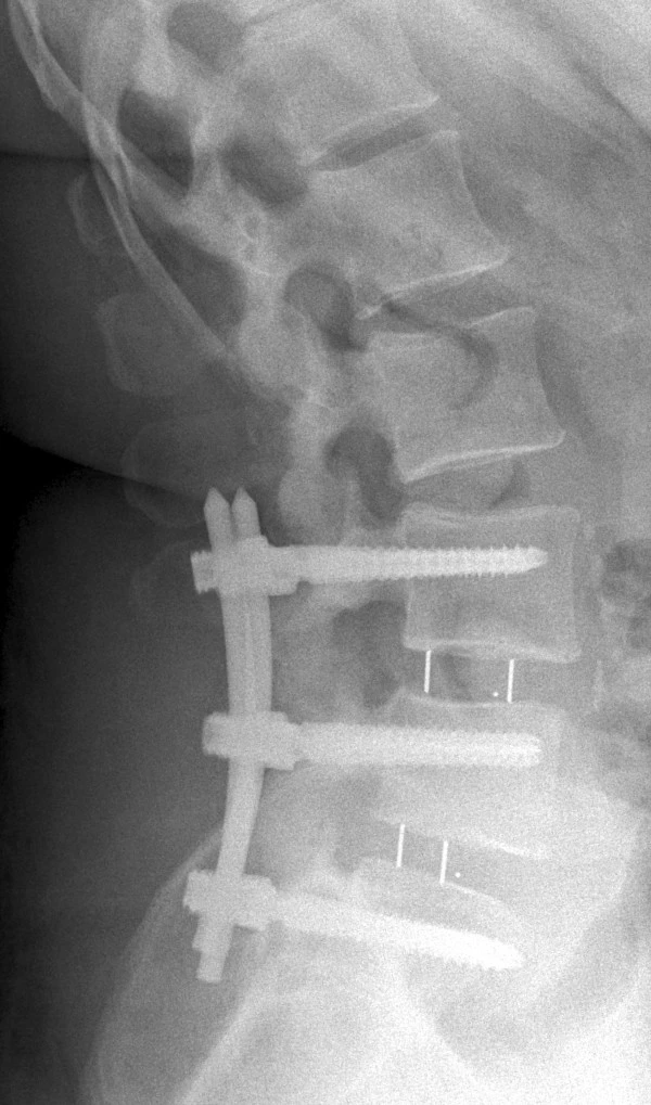 An X-ray of a spine with an interbody fusion device (IFD) inserted. Kate was working with a device that allows researchers to test IFDs without having to put them into human spines first. Picture licensed under Creative Commons, CC BY 4.0. (From Leute et al. 2015. J Med Case Reports 9, 22. https://doi.org/10.1186/1752-1947-9-22 )